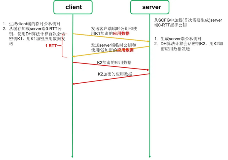 3、客户端在收到0-RTT公钥以后会缓存起来,同时生成自己的临时公私钥对,经过前面的一个RTT后客户端把自己的临时私钥与服务端发过来的0-RTT的公钥根据DH算法生成一个加密密钥K1,同时使用K1加密数据同时附送自己的临时公钥一起发送服务端,此时已有用户数据发送;
