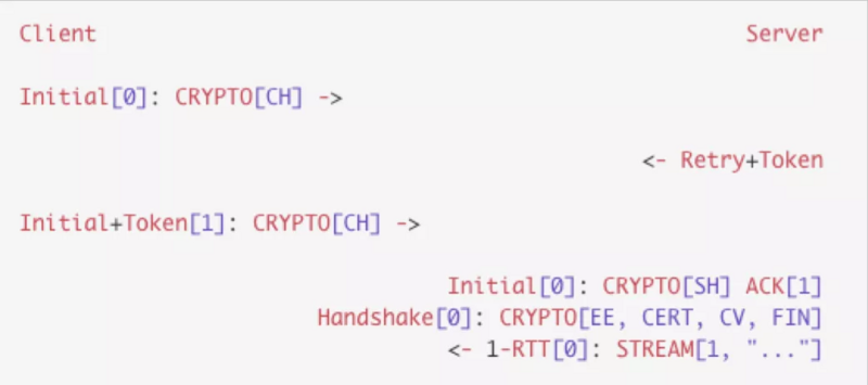•连接建立时,为了验证客户端的地址是否是攻击者伪造的,服务端会生成一个令牌(token)并通过重试包(Retry packet)响应给客户端。客户端需要在后续的初始包(Initial packet)带上这个令牌,以便服务端进行地址验证。