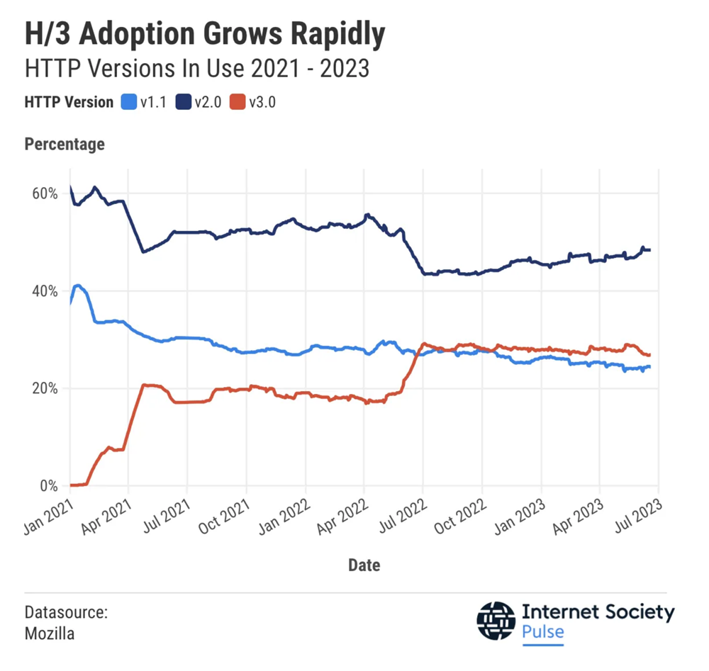 HTTP/3由IETF标准化。今天,很大一部分互联网流量依赖于HTTP/3。以下是显示HTTP/3采用率的图表: