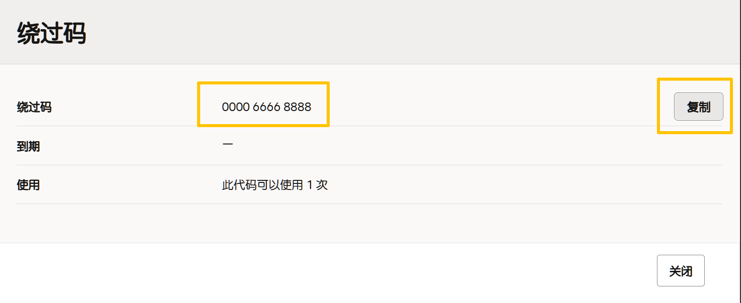 成功登录甲骨文云控制台后,点击右上角【个人图标】,进入【用户设置】,选择【安全】选项卡,将页面拉到最下面的【绕过码】标签,点击【生成】按钮即可生成1个绕过码,点击【复制】存档。